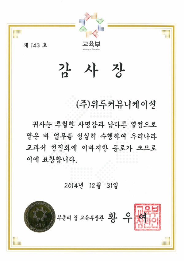 감사장 제 143호 페이지 정보 작성자 WeDu 댓글 0건 조회 6,315회 작성일 19-05-30 19:33 본문 2014-12-31 감사장 제 143호 교과서 선진화 부총리 겸 교육부장관 황우여 List Previous산업통상자원부 표창장 19.05.30 Next한국여성벤처협회 표창장 19.05.30