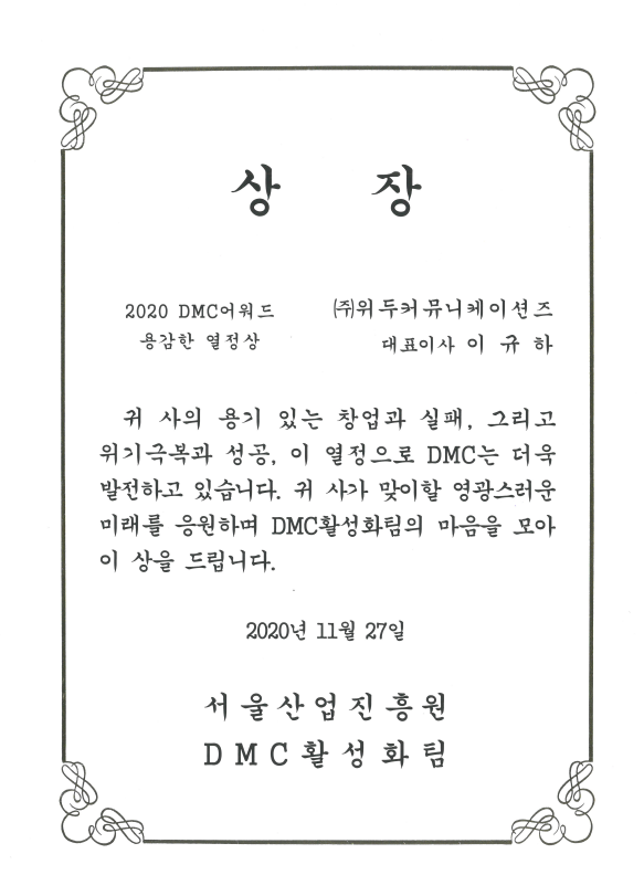 2020 서울산업진흥원 2020 DMC어워드 페이지 정보 작성자 WeDu 댓글 0건 조회 5,991회 작성일 21-12-31 12:57 본문 2020-11-27 2020 DMC어워드 용감한 열정상 서울산업진흥원 DMC활성화팀 List Previous2020 기술혁신 우수기업 21.12.31 Next2018 소년한국 우수 어린이 도서 19.05.30