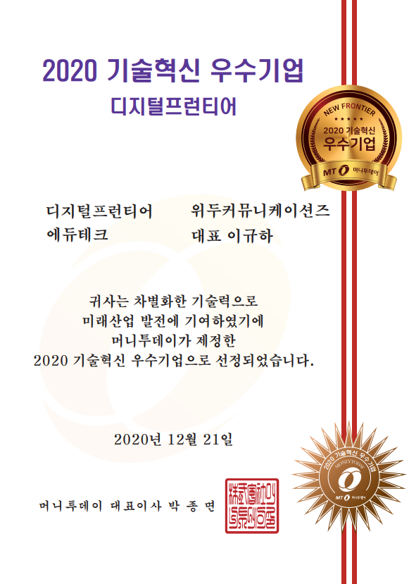 2020 기술혁신 우수기업 페이지 정보 작성자 WeDu 댓글 0건 조회 6,500회 작성일 21-12-31 12:58 본문 2020-12-21 2020 기술혁신 우수기업 디지털프런티어 에듀테크 머니투데이 대표이사 List Previous2020 소년한국 우수 어린이 도서 선정 21.12.31 Next2020 서울산업진흥원 2020 DMC어워드 21.12.31