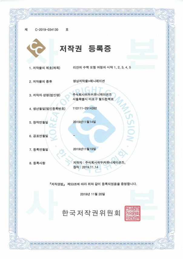 [한국/저작권] 리안의 수학 모험 여정의 시작 1,2,3,4,5 페이지 정보 작성자 WeDu 댓글 0건 조회 6,225회 작성일 21-12-31 12:36 본문 2019-11-20 저작권 C-2019-034130 영상저작물>애니메이션 List Previous[한국/저작권] OLL KIDS/MATH 21.12.31 Next[한국/저작권] 리안의 수학 모험 애니메이션 OST 19.11.25
