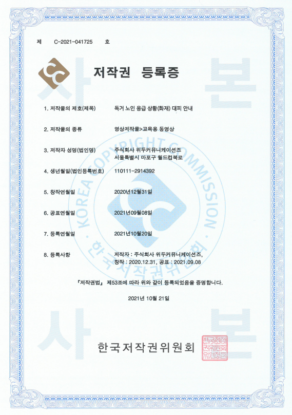 [한국/저작권] 독거 노인 응급 상황(화재) 대피 안내 페이지 정보 작성자 WeDu 댓글 0건 조회 6,763회 작성일 21-12-31 12:41 본문 2021-10-21 저작권 C-2021-041725 영상저작물>교육용 동영상 List Previous[한국/저작권] 장보기 인지훈련 게임 21.12.31 Next[한국/저작권] OLL KIDS/MATH 21.12.31