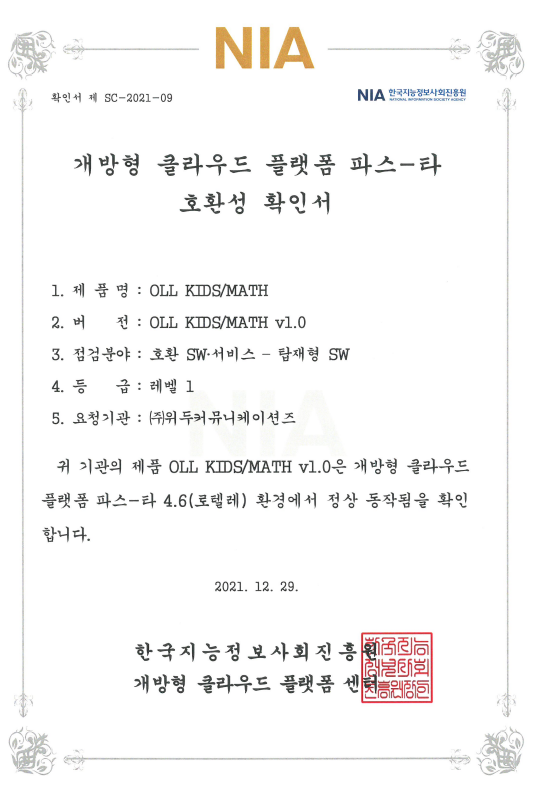 [한국/확인서] OLL KIDS/MATH 파스-타 호환성 확인서 페이지 정보 작성자 WeDu 댓글 0건 조회 10,750회 작성일 21-12-31 12:48 본문 2021-12-29 확인서 제 SC-2021-09 점검분야 : 호환 SW서비스 - 탑재형 SW List Next[한국/인증서] OLL KIDS/MATH 클라우드 서비스 확인서 21.12.31